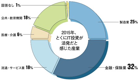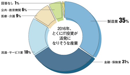 IT投資が活発な産業は2015年が「金融・保険業」だったのに対して、2016年が「製造業」と回答するITベンダーが多かった。工場内にある、さまざまな機器がネットワークにつながるIoTを視野に入れたシステムの導入、ドイツ政府が推進する「インダストリー 4.0」にユーザー企業が関心を高めていることが大きいといえる。