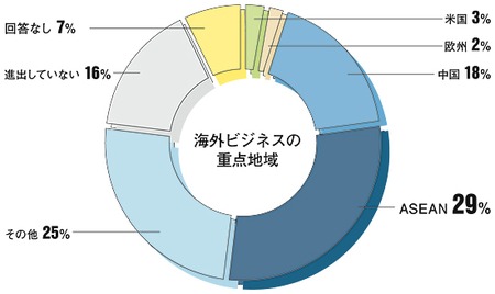 海外ビジネスの重点地域は、「ASEAN」との回答が最も多かった。また、政治問題などまだまだ関係回復に懸念が残る中国については、「市場のポテンシャルは大きい」との認識に留めるITベンダーが増えている。「その他」の国で気になる答えとして、「ドバイ」があった。アジアやASEAN以外の国も視野に入れる傾向が出てきている。