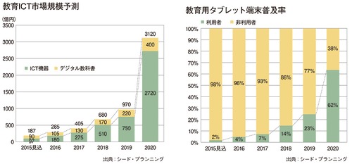●2020年に爆発的な伸びをみせる では、今後、教育現場でタブレット端末や電子黒板、デジタル教科書といった教育に必要なITツールはどれだけ普及するのだろうか。調査会社のシード・プランニングに話を聞いたところ、教育ICT市場は堅調に推移し、19年から20年にかけては前年比2倍以上の伸びが見込めるという。