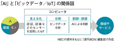 シニアマネージャー ベンダーによってAIの捉え方は、多少の差異がある。顔や指紋の認識センサの開発で世界屈指の実績を誇るNECは、メーカーならではの強みを発揮。認識センサ部品とビッグデータにAIを組み合わせるアプローチを始めている。NECはまた、デバイスから集めたデータを分析するビッグデータのエンジンを開発してきている。そのエンジンを活用することで、AIは「ユーザーに判断候補を提示したり、さらに一歩踏み込んで設備を直接制御する“行動”を起こすまでの領域を担う」(NECの荒井匡彦・ビッグデータ戦略本部シニアマネージャー)ことができる。なお、NECはグループ内のAI関連の技術やサービスを体系化するとともに、現在約500人のAI関連の人員を2020年までに倍増させる予定。また、向こう5年間のAI関連事業で累計2500億円の売り上げを見込んでいる。