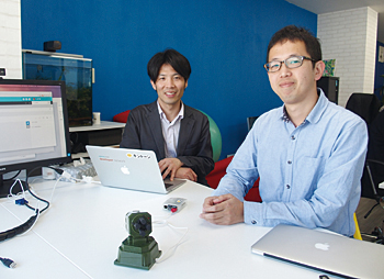 ジョイゾーの四宮靖隆・代表取締役(右)と山下 竜氏。写真中央のミサイル発射台の模型は、クラウドからの指示で動かすことができる