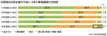 では、今後はどうなるか。日本貿易振興機構(JETRO)の15年度調査によると、今後1~2年の中国の事業展開について、縮小もしくは第三国(地域)への移転・撤退(1.7%)と回答した日系企業は10.5%。一方、拡大は38.1%だった。依然として拡大路線の企業が多いが、縮小傾向は増えている。11年度調査と比べてみると、拡大は28.7ポイント減少、縮小は6.1ポイント上昇した。仮に今後5年間、これと同等の推移が続くとしたら、単純計算で20年には拡大が9.4%、縮小が16.6%と逆転してしまうことになるのだ。