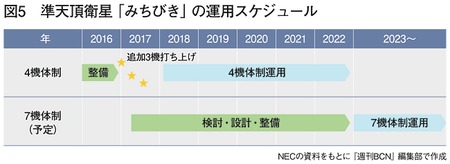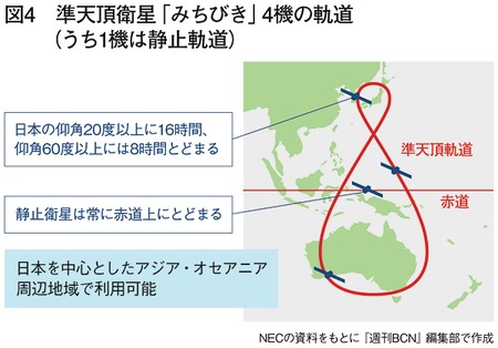当面は「みちびき」4機体制での運用となるが、業務での活用が広がり、日本の「社会インフラ」としての認知度や重要性が高まれば、さらに追加で3機を打ち上げ、計7機体制での運用も現実味を帯びる。機数が増えれば、より精密で安定的、高信頼な測位体制が整う(図5参照)。