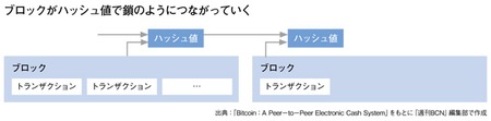 複数のトランザクションデータの塊を一つのブロックとし、新しいブロックを生成する際は、ブロック内のトランザクションの整合性を検証したうえで、一つ前のブロックのハッシュ値(任意のデータをハッシュ関数という関数で演算処理して求める値で、必ず一定の長さの値になる)を当該のブロックに含めて新たにハッシュ値を求める。このハッシュ値は、同様に次のブロックのなかに含まれることになり、ブロックがハッシュ値によって鎖のようにつながっていくことから、ブロックチェーンと呼ばれる。