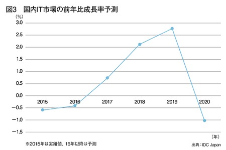 情報サービス業全体を俯瞰してみると、情報サービス産業協会(JISA)が取りまとめている経済産業省「特定サービス産業動態統計」情報サービス産業の売上高推移は、昨年9月、今年3月と前年同月比でマイナスになるなど、ここ数年続いたプラス一辺倒ではなくなる気配が感じられる(図1参照)。同じくJISAが今年3月時点で調査した第1四半期(4~6月期)の「情報サービス業DI値(景気動向指数)」では、プラス幅が減少する傾向がみて取れる(図2参照)。一方、調査会社のIDC Japanは、2020年に国内IT市場の伸びがマイナスに転じると予測している(図3参照)。