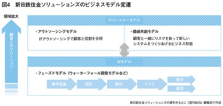 謝敷社長が言う「SIモデル」と「ITパートナーモデル」は、システムの形態というよりは、NSSOL自身の事業モデルにより焦点をあてている点で、ニュアンスが少し異なる。「SIモデル」は、要件定義から設計、開発といったウォーターフォール型の開発手法をイメージしており、「ITパートナーモデル」は、ITアウトソーシングで顧客と役割を分担したり、顧客と一緒にリスクを負って新しいシステムをつくりあげるビジネス形態をイメージしているという(図4参照)。
