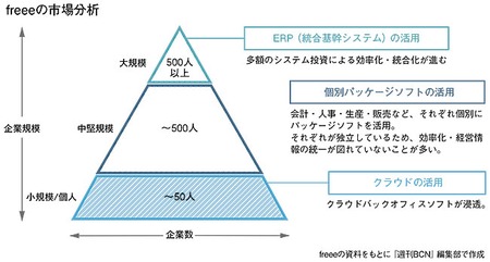 「いままでfreeeは、従業員50人くらいまでの、割と小規模な会社向けのビジネスをやってきたし、市場からもそうみられてきたと思う。しかし、実は従業員500人くらいまでの中規模層のセグメントでもfreeeはどんどん使われるようになってきている。その背景には、中堅・中小企業向けの基幹システム市場で、テクノロジーによる効率化・統合化が相対的に遅れているという状況がある。ほとんどクラウド化も進んでいないし、基本的に会計ソフトしか使っていないユーザーが多く、給与計算、人事管理、販売管理などを使っていたとしても、個別にパッケージソフトを導入していて、経営情報を統一できていないケースが圧倒的に多い」。