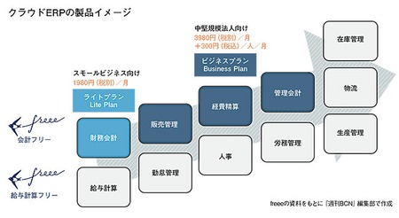 上記のような背景を踏まえ、freeeは中堅・中小企業向けの基幹システム市場で、低コストで導入できるクラウドERPを開発・提供しようとしている。そのための第一歩として、「クラウド会計 freee」の法人向けプランを刷新。従業員500人までの中堅企業向けプランとして、ERPの財務会計、販売管理モジュールに相当し、権限管理や管理会計の機能を強化した「ビジネスプラン」を新たにラインアップした。従来どおりのスモールビジネス向けプランである「ライトプラン」は月額1980円(税別)であるのに対して、ビジネスプランは同3980円。さらに1ユーザーごとに同300円の利用料がかかる。これに、「給与計算ソフト freee」を合わせて導入することで、まずはクラウドERPとしての基礎的な機能を実現したという。