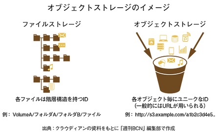 ●ファイルシステムの制約を受けない 階層構造をもつ従来のファイルストレージは、ファイル数が増えるにつれ管理情報が肥大化するため、大量のファイルが存在するとパフォーマンスが落ちたり、フォルダごとのファイル数に制限があった。これに対してオブジェクトストレージには階層構造がなく、各データは一意なIDで管理される。フォルダのなかに複数のフォルダがあり、階層を掘って目的のファイルにたどり着くのが従来のファイルストレージだとしたら、オブジェクトストレージは、一つひとつに通し番号が付けられた多種多様なデータ(オブジェクト)が一つの巨大なバケツのなかに放り込まれているというイメージだ。通し番号さえわかれば、データがバケツのなかのどこにあっても呼び出すことが可能で、ストレージ内でデータの格納場所を変更してもアプリケーションがデータを見失うことはないし、データの数に制限もない。