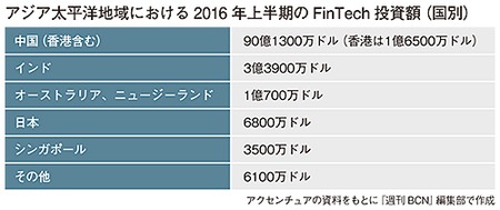 ただし、国別にみるとその9割以上は香港を含む中国の投資で、同国がFinTech大国としての足場を固めつつあることがうかがえる。日本の投資額はというと、中国はもちろんのこと、インド、オーストラリア、ニュージーランドの後塵を拝し、6800万ドルで4位だ。APAC全体のFinTech投資額のわずか0.7%に過ぎない。