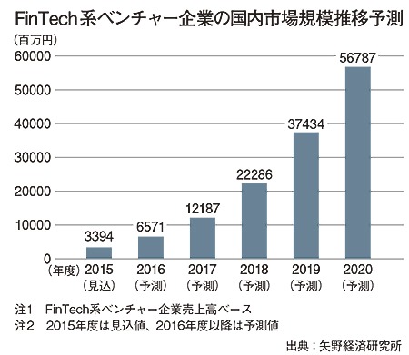 それでも、肌感覚としては「日本だってFinTechが着実に盛り上がってきている」という声も少なくないのではないだろうか。事実、株式市場におけるFinTech銘柄の人気は非常に高く、さまざまなかたちでFinTechへの投資が急拡大していくのは確実だろう。矢野経済研究所は、今年3月に国内FinTech市場の調査結果を発表したが、15年度(16年3月期)の国内市場規模は33億9400万円、20年度には567億8700万円まで成長すると予測している。この間の年平均成長率は約76%だ。