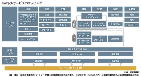 新経連の提言では、「世界先端FinTech大国の実現」を目的として、「FinTechの肝であるデータ活用と自動化の前提となる金融機関のオンライン化、企業のクラウド化、決済のキャッシュレス化の推進」「商流データやその他クラウドソーシングデータなども活用した新しい与信のあり方の検討や、それに対応するための規制の見直し」などにKPIを設定して取り組むべきとの見解を示した。このなかで最新のFinTechサービスマップも整理した(図参照)。この図をみると、FinTechを構成するのは必ずしもベンチャー企業が新しく始めたサービスだけではなく、多くが既存の金融機関やITベンダーが生業としてきたビジネスであることがわかる。現在のFinTechは、このマッピング図のそれぞれのサービス同士が縦横に連携することで新しい価値を生み出そうという試みが主流だ。矢野経済研究所の調査でも、直近の15年度の国内FinTech市場は、「メガバンクグループや大手SIerがベンチャー企業向けイベントが多く開催され活況を呈したほか、ベンチャー企業と大手企業との協業事例などで市場は盛り上がりをみせている」と指摘。FinTechは、オープンイノベーションが有効な代表的な分野であるともいえるのだ。