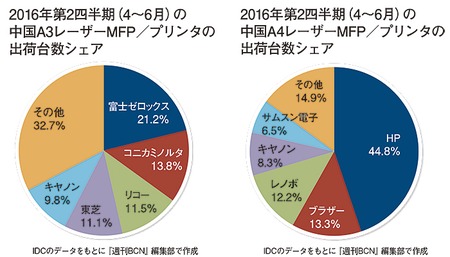 13億人もの人口を抱える中国は、プリンタ/複合機(MFP)の市場も巨大だ。調査会社IDCによると、2016年第2四半期(4~6月)の中国レーザープリンタ/複合機の出荷台数は220万6000台。同期間の日本の出荷台数は31万4000台なので、単純に比較すれば、中国は日本の約7倍の市場規模になる。この巨大市場を牽引しているのは、日系を含む外資系メーカーだ。IDCのデータによると、16年第2四半期の中国A3レーザー複合機/プリンタ出荷台数で、シェア上位5社は日系メーカーが独占。A4市場はHPの一強状態にあるが、日系も多くのシェアを獲得している。SIやソフトウェアなど、ほかのITの領域で中国ベンダーが市場の大部分を握っていることを考慮すれば、プリンタ/複合機は極めて異質な市場だといえる。