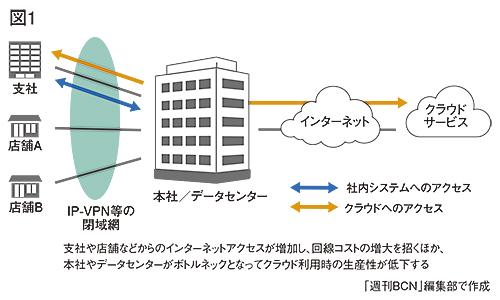 本社やデータセンターと支社、店舗、工場などのリモート拠点との間を結ぶWAN(Wide Area Network)としては、かつては専用線が、そしてここ10年ほどはIP-VPNや広域イーサネットなど閉域の公衆網が主に利用されてきた。もちろん、現代の業務では社内の情報システムに加えてインターネット上のさまざまなアプリケーションを利用するが、全社でアクセス権やセキュリティポリシーなどを統一するため、社内とインターネットとの接続点は本社や自社データセンターの1か所に集約し、各リモート拠点のユーザーがインターネットへアクセスする際もいったん本社を経由するネットワーク構成を採るのが一般的だ(図1参照)。