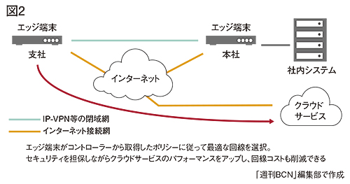 またSD-WANでは、異なる複数の物理的な回線を効率よく利用できるのが重要なポイントだ。前述のように、最近では業務でのクラウドサービスの利用が盛んになっているが、エンタープライズ向けの一般的なSaaSの場合、サービス側で一定のセキュリティレベルを担保している。それらのクラウドサービスに各拠点からアクセスする場合は、ネットワークのボトルネックになりがちな本社やデータセンターを経由するより、直接インターネットに抜けてしまったほうが快適に利用でき、貴重な本社-支社間のネットワーク帯域を消費しなくてもすむ(図2参照)。