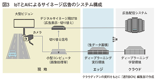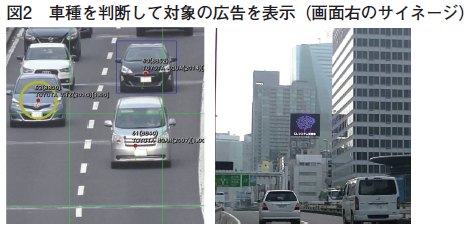 ターゲットは、自動車だ。車種が把握できれば、富裕層かどうか、ファミリー層かどうかが簡単に把握できる。使用するIoTデバイスはカメラ。取得した映像をAIで処理し、車種を特定する。そして、広告主がターゲットとする車種の場合、サイネージ上に広告を表示する(図2、図3)。