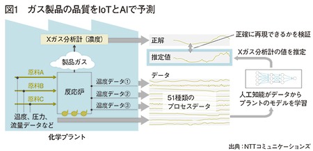 そこで三井化学は、センサから集めたデータをAIで分析。ガス製品の品質異常や製造機器の故障、さらに異常データかセンサの故障かを判断できるようにした。また、ガス製品の品質異常に関しては、20分先までを正確に予想できるようにしたことで、事前の対処が可能になった。20分先の予想と実際の値とは、平均誤差が3%以内に納まっている。製品の品質異常を事前に回避できるため、化学プラントの稼働率向上にも貢献している(図1)。
