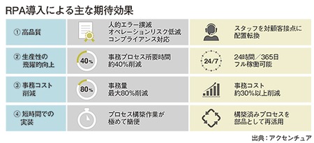 「金融機関は規制が強化されるたびにプロセスが複雑になり、入力のチェックなどに膨大なコストがかかっている。一方で、低金利などの影響で収益率は下がっている。また、日本では金融機関の統合が進んだ影響で、システムが乱立する状況にあることも、オペレーションを複雑化している。そのため、効率化のニーズは強い」とアクセンチュアの中野将志・執行役員 金融サービス本部統括本部長は、AI・RPA領域の専門チーム設立の背景を語る。RPAを導入すれば、既存システムのままで、業務を効率化することができる。