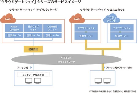 AWS上の仮想サーバーとそれにつながる閉域ネットワークをパッケージとして提供する「クラウドゲートウェイ アプリパッケージ」および、AWSまたはニフティクラウドにインターネットを経由しないVPNで接続できる「クラウドゲートウェイ クロスコネクト」の2サービスが用意されており、ユーザー企業はすでに利用している「フレッツ 光ネクスト」などの回線を利用してパブリッククラウドへの閉域接続が可能になった。