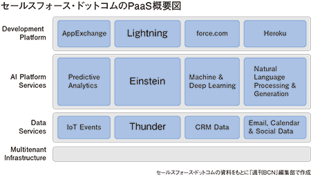 セールスフォース・ドットコムは、もともと2007年にPaaSという概念を提唱したパイオニアであり、CRM、SFAなど同社のSaaSのプラットフォームを「Force.com」としてリリースしたのがPaaSの元祖といわれる。ユーザー管理や画面設計、各種APIといった基本的な機能を網羅していて、主にフロント系の業務アプリケーションをノンプログラミングで構築することができるという特徴を備えていた。