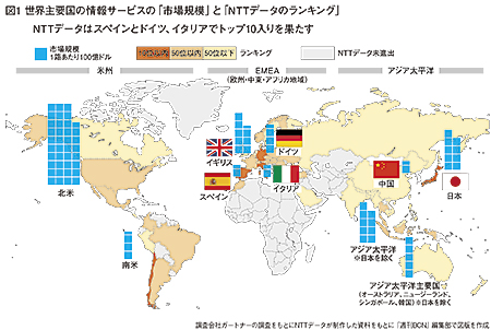 図1は、調査会社ガートナーの資料をもとにNTTデータが作成した主要国・地域の情報サービスの市場規模と、NTTデータのポジション(ランキング)を示したものだ。NTTデータブランドの確立には、その国・地域の情報サービス業ランキングで上位に食い込む必要がある。足元をみると、スペインやドイツ、イタリアなどでは10位以内に食い込み始めており、徐々にではあるが存在感を高めている。欧州市場を巡っては、14年にバチカン教皇庁から受注した図書館デジタル保管事業が、欧州圏でのNTTデータの認知度を高める重要なきっかけになった。