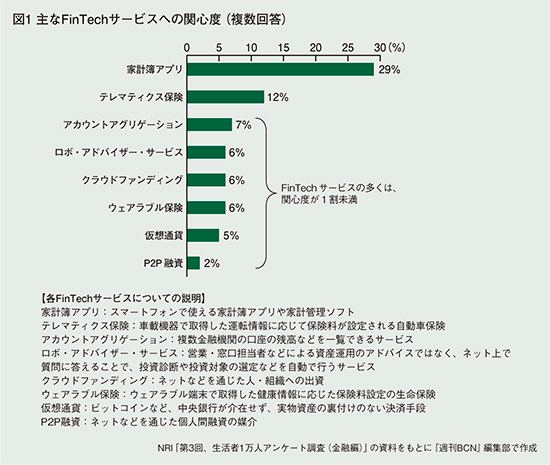 16年12月、FinTechに関する調査レポートが情報サービス業界で話題になった。野村総合研究所(NRI)が3年に一度実施している「生活者1万人アンケート調査」の金融編で、FinTechサービスの多くは関心度が1割未満だったことが判明したからだ(図1)。関心度が最も高い項目が家計簿アプリの29%、テレマティクス保険が12%で、クラウドファンディングや仮想通貨、P2P融資などは多くの項目で一桁台だった。