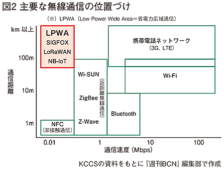 図2で示した通り、LPWAは通信速度が速く、電力消費も大きいWi-FiやLTEとは対極に位置すると同時に、ICカードなどで使われる非接触通信(NFC)やZigBeeのような近距離無線通信よりもはるかに広域で通信が可能になる点が、従来の無線通信方式とは大きく違う点である。