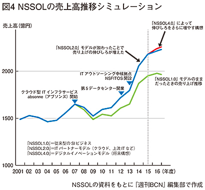 多くのSIerは、ユーザーの要望通りにソフトウェアを開発する受託仕事から始まって、その後は、ユーザーの業務を効率化したり、売り上げにつながるような提案型の営業スタイル、さらにはBPOやITOなどのアウトソーシングによってストック型ビジネスを増やすことで事業を伸ばしてきた。NSSOLでは、受託ソフト開発中心の従来型のSIビジネスを「NSSOL1.0」と呼び、クラウドや上流工程から顧客と一緒になってITシステムを考える“ITパートナーモデル”を「NSSOL2.0」と位置づけている。2000億円超は、まさに1.0と2.0の組み合わせによって達成できたといえる。