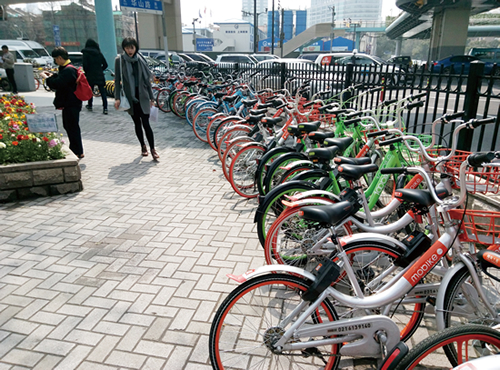中国政府は、「第13次5ヵ年計画」の発展理念として革新・調和・グリーン・開放・共有を掲げ、伝統産業とインターネットの融合を進める「互聯網+」や「共亨経済(シェアリングエコノミー)」を推進している。自転車シェアリングサービスは、こうした政府方針に則ったサービスで支援も手厚いとあって、参入業者が相次いだ。昨年夏頃まで、上海の街中で主にみかけるのはオレンジ色が目印の摩拜単車(mobike)だけだったが、その後は黄色の共享単車(ofo)が急増。さらに、小鳴単車(Xiaoming Bike)、百拜単車(100bike)、永安行(youon)と、日増しに新顔をみかける。なかには、電気自転車専門のシェアリングサービスもある。