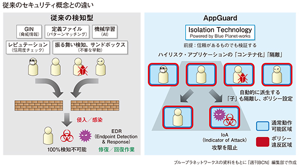 AppGuardは、「システムが正しく動作・機能することを守る」ことを基本コンセプトとして、システムに異常動作を起こさせず、正常な動作しか行わせないようにする技術だ。それを実現するにあたっては、同社が「Isolation Technology powered by Blue Planet-works」と呼ぶ技術を用いている。具体的には、マルウェアの感染リスクが高いアプリケーション(Microsoft Office、Javaなど)が動作する際にコンテナ化して隔離し、不正なプロセス、メモリへの書き込みやOSへの不正行為など、設定したポリシーに応じて動作を制限し、ポリシー違反の動作を阻止する。さらに、コンテナ化したアプリケーションから派生した「子」にあたるプロセスについても、ポリシーを継承したうえで、自動的にコンテナ化して隔離し、動作を監視する。