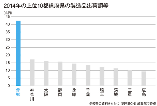 愛知県の2014年の「製造品出荷額等」は、前年比104.4%の43兆8313億円。2位の神奈川県の倍以上で、1977以来、38年連続で全国1位を獲得している。今後も成長するためには、中小企業も含めた全体の底上げが不可欠だ。愛知県では、産学官が連携し、IoTの利用促進を目指す取り組みも始まっているが、企業間の温度差が課題として浮かんでいる。