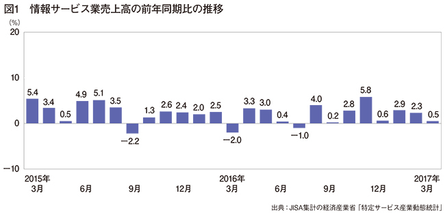 NTTデータは連結売上高2兆円の大台を射程内に収めており、伊藤忠テクノソリューションズ(CTC)も2006年の旧CRCソリューションズとの統合後最高となる4000億円超を達成。同じく商社系SIerのSCSKは5期連続の増収増益を達成し、戦略事業と位置づける車載OSの「AUTOSAR」事業も本格的に立ち上がり始めている。高成長を続けてきた野村総合研究所(NRI)は、若干の足踏みをしているが、19年3月期までの中期経営計画の連結売上高5000億円の目標は変えない考えだ。主要SIerがおおむね好調に業績を伸ばしており、情報サービス産業協会(JISA)が取りまとめている経済産業省の特定サービス産業動態統計でもプラス成長の傾向が続いていることがみてとれる(図1参照)。ITインフラの急速な世代交代やサービス化・グローバル化への一段のシフト、あらゆる業種業態に波及するデジタライゼーションの変化に、SIerがどのような戦略をもって臨んでいるのかをレポートする。