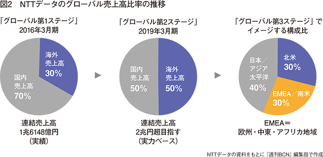 そこで、NTTデータでは、海外ビジネスの展望を示す「グローバル第2ステージ(17年3月期~19年3月期)」の最終年度となる来年度に改めて連結売上高2兆円超を掲げ、うち海外売上高比率を50%に高める。さらに、次の「グローバル第3ステージ」で目指すべき姿として、売上高構成比を北米30%、EMEA(欧州・中東・アフリカ地域)/南米30%、日本とアジア太平洋地域で40%をイメージしている(図2参照)。