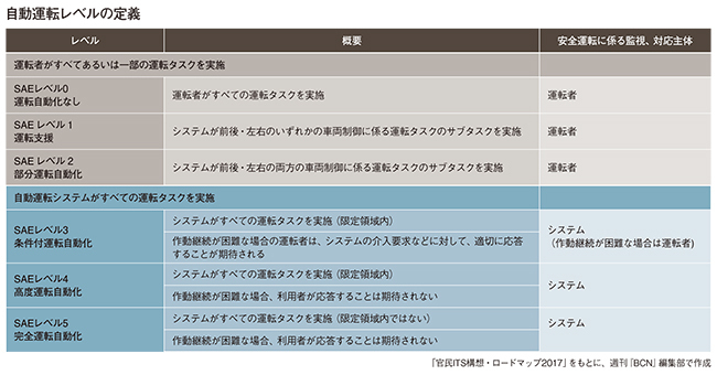自動運転は、運転者の関与状況などに応じてレベル分けされている。ロードマップが採用するのは、SAE(Society of Automotive Engineers)の基準で、すべての運転を人間が担う「レベル0」から、すべての運転をシステムが担う「レベル5」まで6段階になっている。