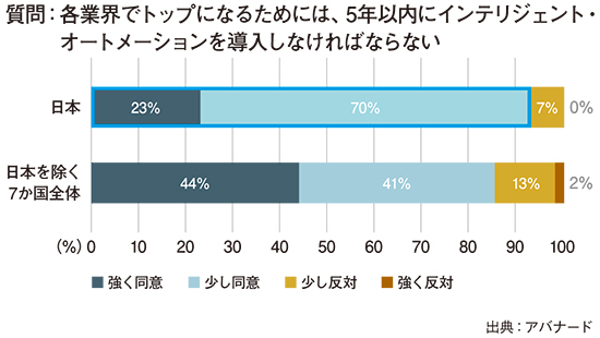 「日本企業の経営者は、9割以上がAI導入を必須だと考えている」。アバナードが、2017年5月が6月にグローバルで実施した調査結果である。質問は「各業界でトップになるためには、5年以内にインテリジェント・オートメーション(AI活用による自動化)を導入しなければならない」。日本企業のビジネスリーダー800名は、23%が「強く同意」、70%が「少し同意」と回答している。時代は、“AIファースト”へ。経営層の期待に、どう応えるべきか。IT業界が担う役割は過去最大級の大きさといえよう。
