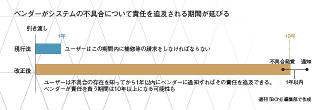 細かく説明すると、現行の民法では、ユーザー企業と委任契約を結んだベンダーは、構築・納品したシステムに対して「瑕疵担保責任」がある。システムに不具合(瑕疵)があった場合、ユーザーはベンダーに対して、不具合の程度などに応じて追加費用なしでの修正や損害賠償、契約解除を求めることができるのだ。今回の法改正では、「瑕疵」に代わって「契約不適合」という言葉が使われるようになり、責任追及の具体的な手段として、不具合の修正、損害賠償、契約解除に加えて、ユーザーがベンダーに支払う報酬の減額請求ができることを明文化した。そして、現行法では、ベンダーが瑕疵担保責任を負わなければならない期間は、完成したシステムの引き渡し時から1年以内だったのに対し、改正後は、ユーザーが契約不適合の事実を「知ったときから1年以内」、つまり、不具合をみつけた時点を起点として1年以内になる。これにより、ベンダーが契約不適合の責任を負わなければならない期間が実質的に延びるわけだ。飯田弁護士も、ベンダーの立場である日本総研の大谷氏も、これが「今回の法改正の内容で一番インパクトが大きい」と口を揃える。