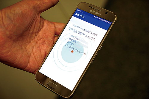 そのため、無駄な作業を削減するため、作業指示書と小型のビーコンをQRコードで紐づけし、位置情報によって対象の仕掛品が工場内のどこにあるかを可視化。さらに、スマートフォンのアプリを用意し、仕掛品に近づくと、ビーコンと連動して音などで通知するようにした。