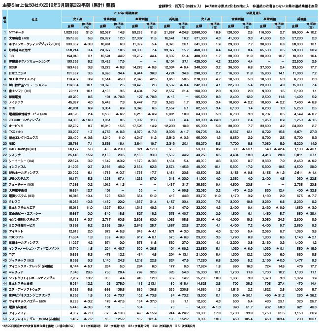 NSSOLは、親会社の新日鐵住金グループ向けと、主要セグメントの金融顧客向けのプロジェクトの一部がピークアウト。この上期は両顧客向けの売り上げがいずれも前年同期比でダウン。それにもかかわらず、流通サービスや公共公益の顧客、ITインフラのビジネスなどで補ったことで、上期連結売上高は前年同期比10.1%増、営業利益も2.5%増の増収増益となった。通期(18年3月期)の傾向も変わらず、新日鐵住金と金融の減収を他でカバーすることで、売上高は前年度比4.1%増の2420億円、営業利益は同5.4%増の227億円を見込んでいる。