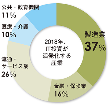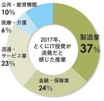 具体的な数字をみると、まず、17年を振り返ってIT投資がとくに活発だった産業は製造業が37%、金融・保険業24%、流通・サービス業23%、医療・介護6%、公共・教育機関10%。18年にIT投資が活発化すると推測される産業については、製造業37%、金融・保険業16%、流通・サービス業26%、医療・介護10%、公共・教育機関11%という結果になった。