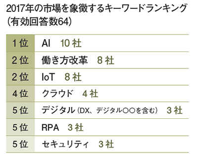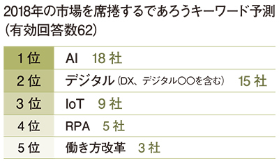 前問を受けて、18年の市場はどんなキーワードを中心に動いていくのかという予測についても聞いてみた。結果は、「AI」18社、「デジタル」15社、「IoT」9社、「RPA」5社、「働き方改革」3社となった。