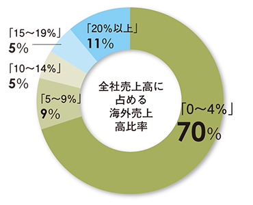 海外ビジネスの実績がある、もしくは海外進出の意欲があるITベンダーのトップを対象に、現状を聞いた。まず、全社売上高に占める海外売上高比率については、「0~4%」が圧倒的に多く、70%にのぼった。そのほか、「5~9%」が9%、「10~14%」が5%、「15~19%」が5%、「20%以上」は11%となった。ほとんどのベンダーにとって、海外ビジネスはまだまだ主力とはいえず、海外進出を目指そうとしているにせよ、実態はドメスティックなビジネスに頼っているケースがほとんどだ。一方で、2番目に多かった回答が20%以上だったことから、海外市場で成果を得つつあるベンダーも少なからず出てきている状況がうかがえる。こうした傾向は、次の設問の回答結果にも表れている。