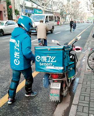 平日の昼過ぎ。赤や青、黄色の色鮮やかなジャケットを着た人たちが、電気スクーターに取り付けてあるボックスから荷物を取り出すと、急ぎ足でオフィスビルに駆け込んでいった。北京や上海では見慣れた光景だ。そう、彼らはデリバリサービスの配達員。昼休憩の時間帯には、多くのビジネスマンが食事の出前を利用するため、配達員にはひっきりなしに依頼が舞い込んでくる。急いでいたのはそのためだ。