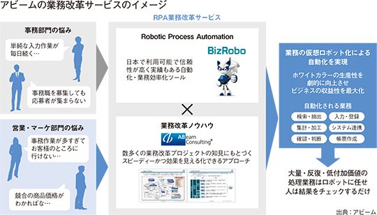 アビームコンサルティングが昨年6月にリリースした、SAPのERP向けRPAに関わる業務を自動化するロボット「ERP Automation Robot For SAP ERP」。同社はもとあもと、コンサルファームとして培ってきた業務改革ノウハウとRPAツールを組み合わせた「RPA業務改革サービス」を提供しているが、RPAテクノロジーズの「BizRobo!」とERPの周辺業務向けノウハウを融合させたものだ。