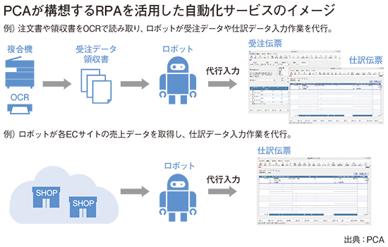 基幹系業務システムまわりの業務自動化にRPAを活用しようという動きは、中堅・大企業向けのERPの世界だけの話ではない。中堅・中小企業向け基幹業務ソフトベンダー大手のピー・シー・エー(PCA)は、RPAツールを活用し、PCAの業務ソフトへのデータ登録作業などをロボットに代行させて自動化するサービスを検討中だ。