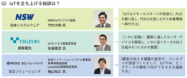 NSWはToami案件で、本番稼働しただけで80社に導入した。竹村部長は、「IoTはスモールスタートが前提だ。PoCを繰り返し、PDCAを回しながら本番環境へ移行する」と、つくり方が従来のSIと根本的に違うという。IoT開発で、PoCの段階が重要であることはSIerであれば理解しているはずだ。PoCを成功に導くためにはまず、どういうセンサをどこに設置し、多くのセンサをどんな通信でつなぎ、どんなデータを取得すれば、価値を生むデータになるのか。