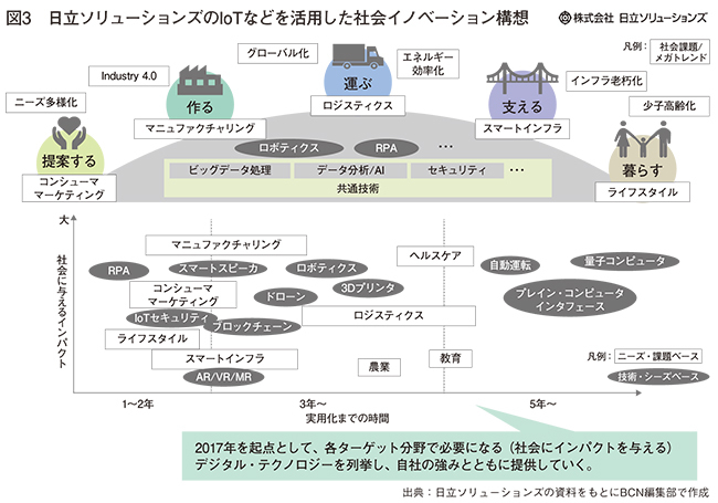 日立製作所内で初めて、CLO(Chief Lumada Officer)の称号を得たHisolの社会イノベーションシステム事業部の髙橋明男・副事業部長兼Lumada企画推進室副室長は、こう指摘する。「将来的に従来型のSIは減ることが予想される。当社のような大手SIerでも、ものづくり企業からコトづくりをするベンダーに変革することが求められる。当社は『デジタルビジネスのサポーター』になれるようにする」。同社では現在、主に製造業などの「マニファチャリング」領域でIoTを提案しているが、ロジスティクスやスマートインフラ、ライフスタイルなど、社会の全領域で、IoTやAIなどを活用したデジタルビジネスの拡大構想を描いている(図3)。