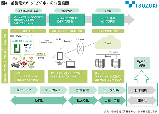IoTのシステム開発をするうえでは、部材・商材、通信環境、情報システム、AIなどのテクノロジーを含め、必要な要素が多岐にわたる。各領域に関する技術スキルをもつ人材確保も課題だ。そういう意味で、マルチで各領域に強いソリューションをもつベンダーとの連携で、都築電気は数多くのメーカーなどと強固なアライアンスを築く。製造・組込み領域では、ワイヤレスモジュールや生産現場の各種ソリューションと、無線・ネットワーク構築でも、LPWA(Low Power Wide Area)の標準化団体や通信キャリアと、従来の得意技である情報系のクラウド構築・運用で基幹システムをもつメーカーの商材を扱う。佐藤室長は「特定の領域に強いベンダーとマッチングし、IoTビジネスを拡大する」と、センシング、データ収集、設備管理、データ分析に加え、将来の自律制御の全カテゴリで製品やソリューションを揃える(図4)。