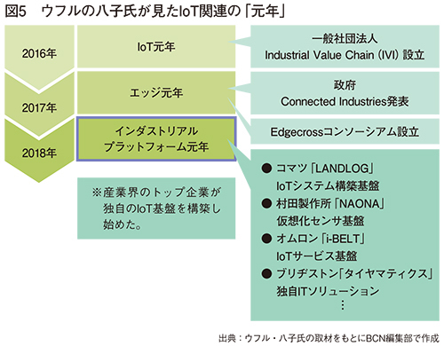 ウフルでは、2016年を「IoT元年」、17年を「エッジ元年」と位置づけた。そして18年は「インダストリアル・プラットフォーム元年」だ。16年には、IoTの導入事例が増加。17年には政府が「Connected Industries」というコンセプトを提示。つながる産業の世界観が描かれキーワードとして刺激を与えた。また、リアルタイム性が求められエッジ側でデータを処理する必要性が出てきた。18年は、IT会社でない企業がIoT基盤を立ち上げ、センサやデバイスなどをつなぎ、そこで得たデータをオープンにし他社に提供する動きが、一段と活発化すると予測している(図5)。