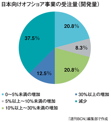 ただし、開発量が減少したベンダーも37.5%と一定数を占める。東南アジアへの移行を進めるなど、中国のオフショア開発の位置づけを見直す企業が多いのも事実。すでに中国からは撤退済みの企業も相当数あり、本アンケート調査の対象のなかでも、オフショア事業を展開している企業の数は回を追うごとに減っている。