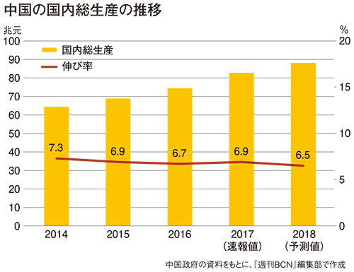 伸び率をみると、かつては二桁成長をした年もあったが、最近は6~7%台の伸び率で推移し、17年の伸び率は6.9%だった。これまでのいけいけどんどんの状況を考えると、「中国の成長は鈍化している」との見方もある。